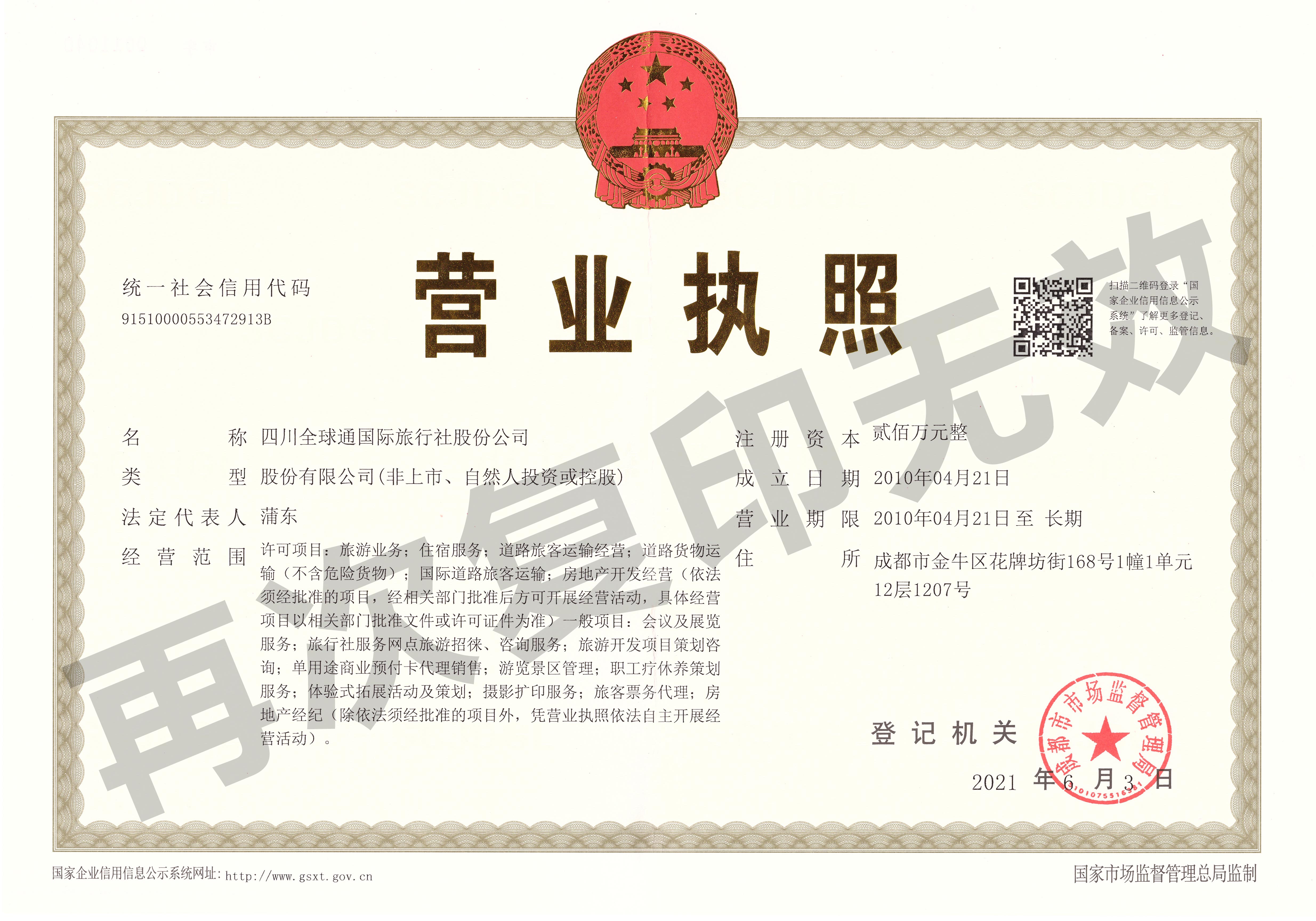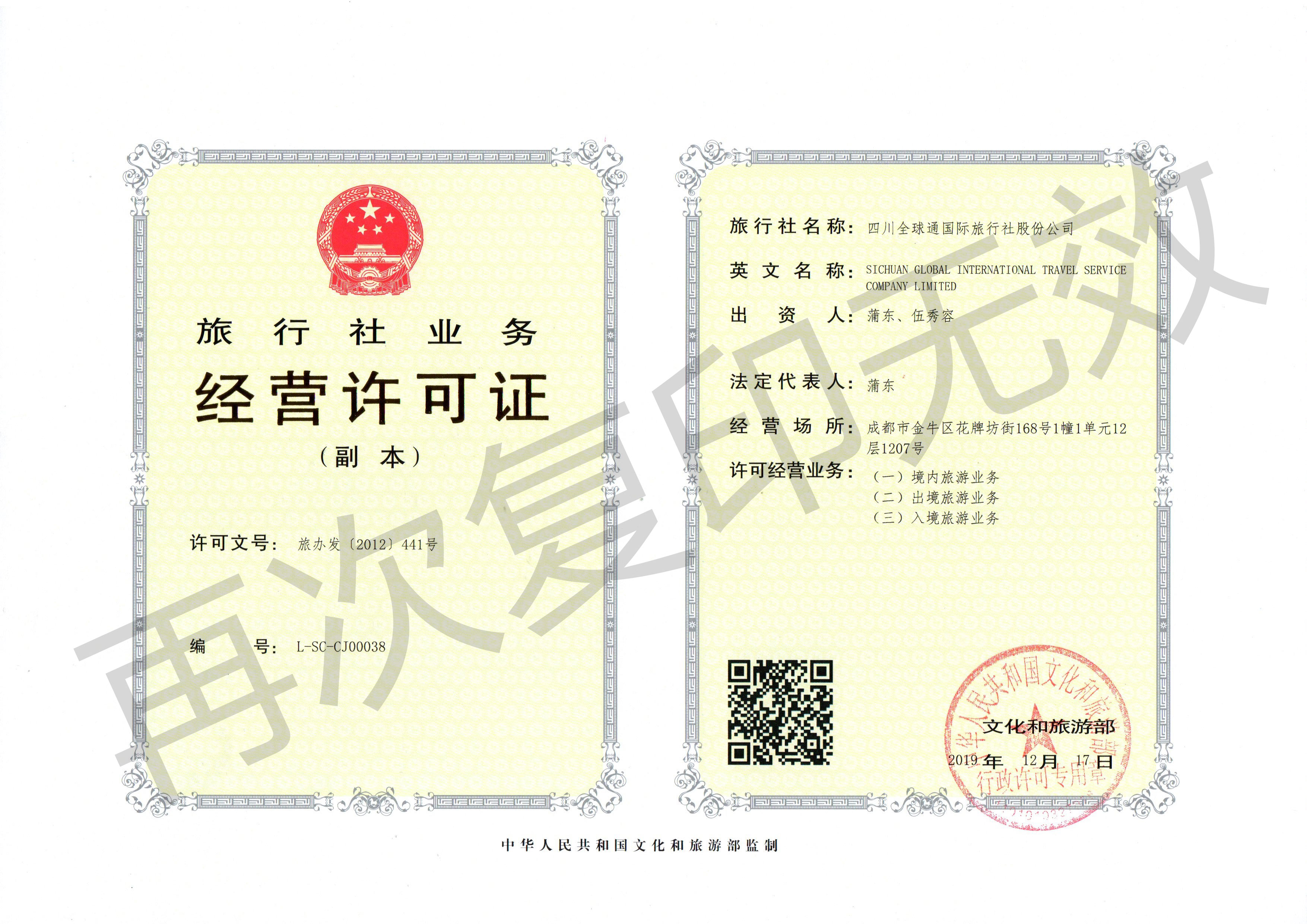 四川全球通国际旅行社股份公司是国家旅游局批准,许可证号为L-SC-CJ00038,主要从事国内旅游、入境旅游业务和出境旅游业务;公司是四川省旅行社协会、重庆旅游协会、中国旅行社协会单位。